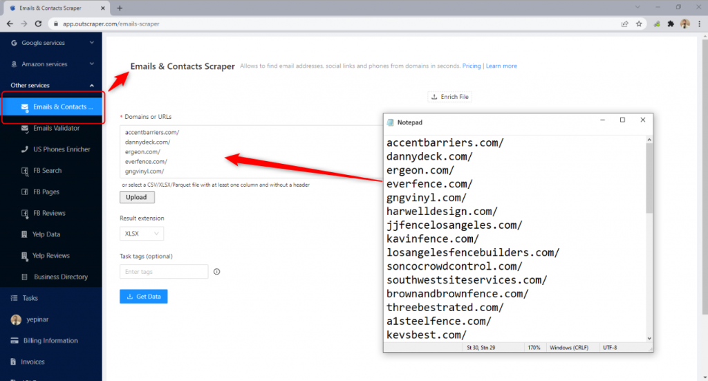 The tool can be accessed by selecting ‘Emails and Contacts Scraper’ service from the dashboard’s left panel that welcomes you after you registration. Using the service is very easy. It just wants us to paste the list in the ‘Domains or URLs’ box or upload the list directly as CSV/XLSX/Parquet file.
