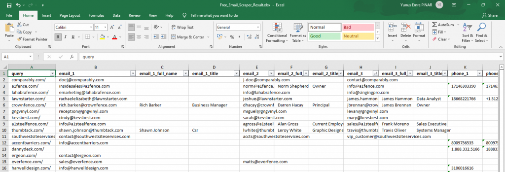 All that’s left is to click the ‘Get Data’ button after doing this. The result will be directly in our hands. If you are curious about the result of this task, you can download it here: Free_Email_Scraper_Result