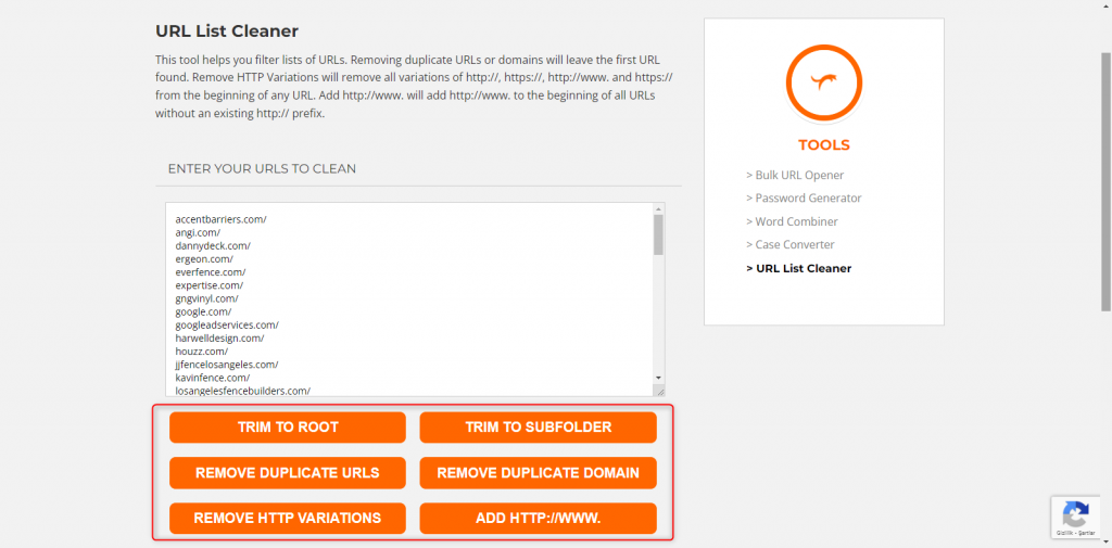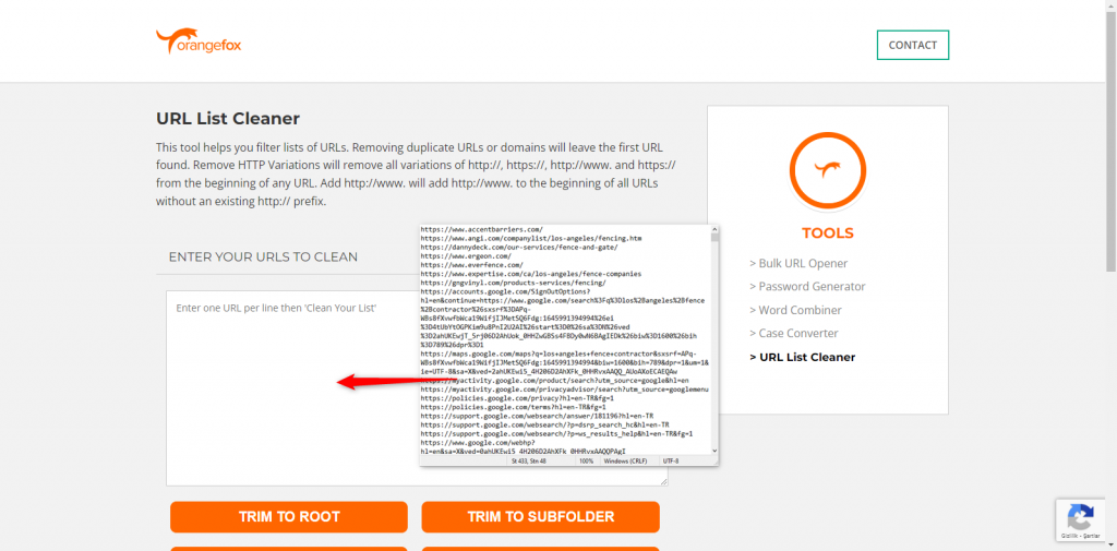 Scanned the 5 page results with Link Grabber and extracted the list. Of course, there are a lot of links in it. It won’t work for us in that way. That list need to be cleaned. At this point we will use Orange Fox URL List Cleaner Tool, which is another free web service. Copy all domains in Notepad and paste them into Orange Fox.