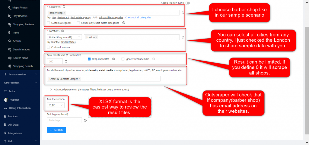 Let’s go through an example scenario. For example, you have an offline business where you produce and sell special shaving soap for men and you want to promote it to barbers all over the UK. What your sales team need is the phone numbers and addresses of all barbers. You need to support your team with online marketing hacks and strategies. This is where Outscraper comes into play. See how it will work for you.