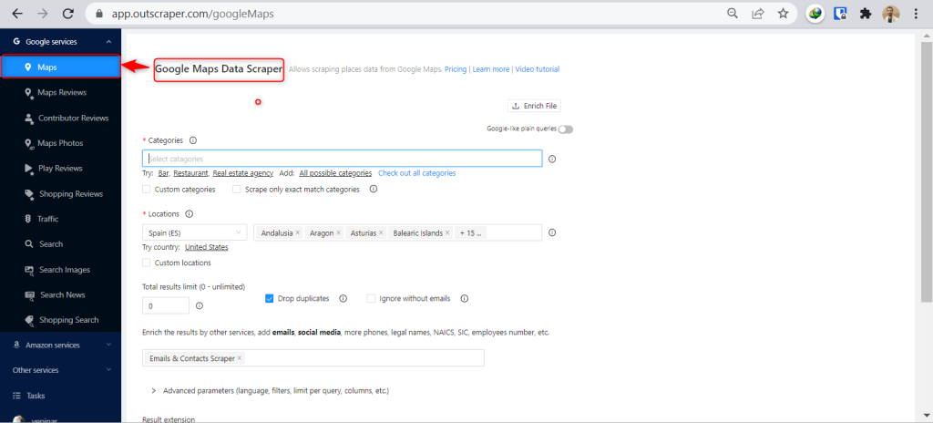 Outscraper Google Maps Scraper service scrapes the business from anywhere in the world for you according to the keywords and categories you have determined, and allows you to download them as a list. If you combine it with the Emails & Contacts Scraper service; Outscraper service, will scrape email addresses, social media accounts, and contact information from the companiesโ websites and add them to the list.