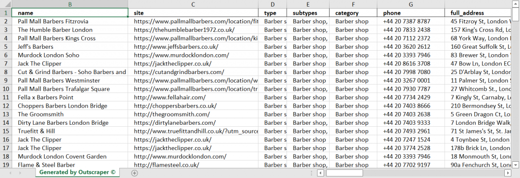 If you want to take a look, you can download the sample file here: Barber Shops London Result File